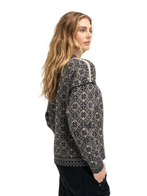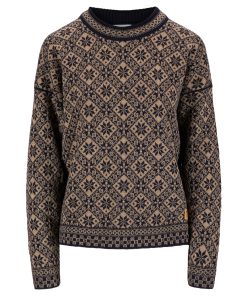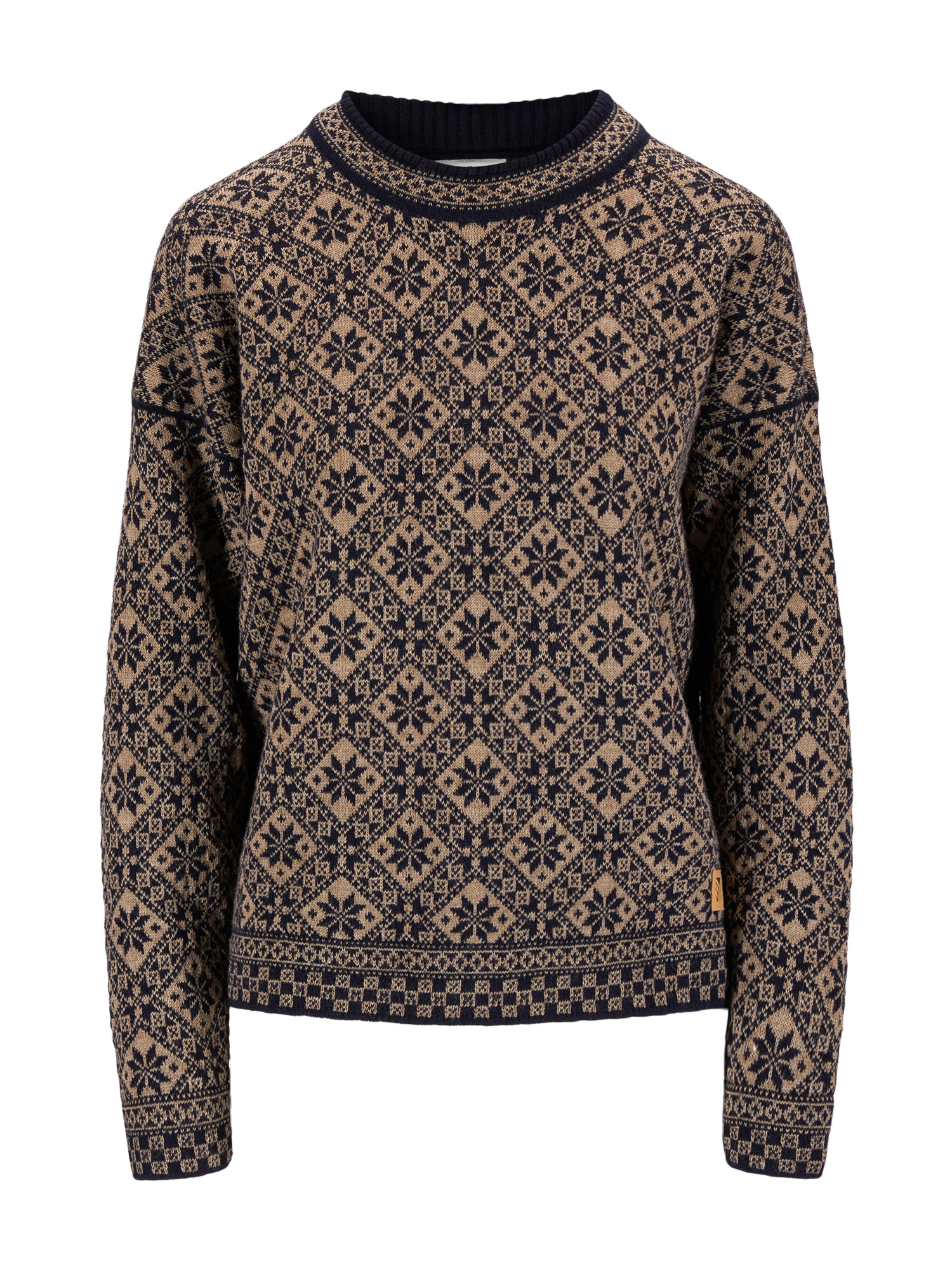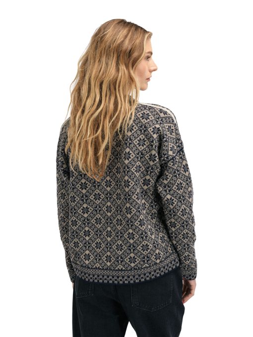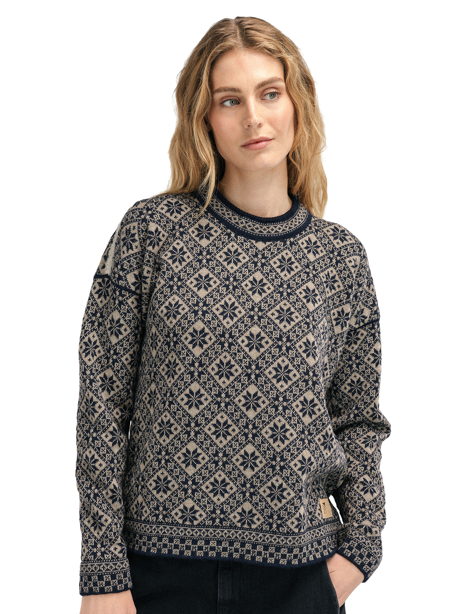 A reinterpretation of the famous Sotra sweater, easily recognizable by a repeating pattern of eight-petal roses. This lightweight wool sweater is has a relaxed fit with dropped shoulders creating a boxy silhouette. Knitted in 100% fine Norwegian wool, with neckline in skin soft merino wool for added comfort.