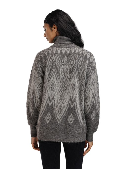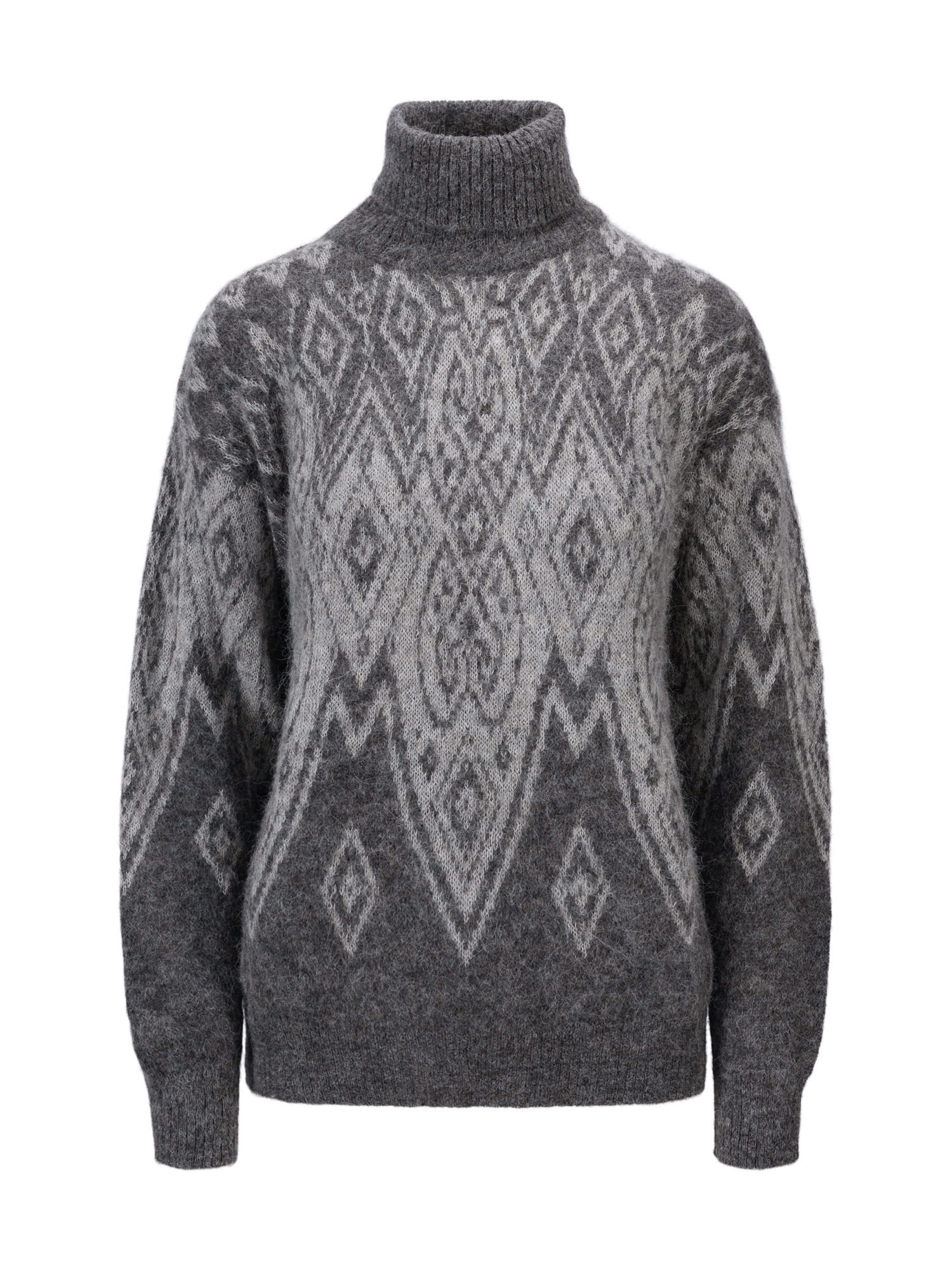 Experience the ultimate blend of heritage and modern luxury with the Falun Alpa sweater. This high-neck sweater with rib finishes gets its additional name “Alpa” from the exquisite alpaca yarn used in its construction. Crafted with brushed alpaca yarn that is naturally undyed, the sweater highlights the natural tones of Peruvian alpaca fleece. Alpaca is a smooth fiber that can easily separate. In this yarn, the fibers are held together by recycled polyester, sourced from post-consumer plastic bottles.