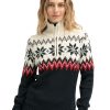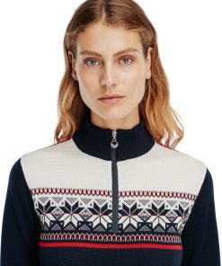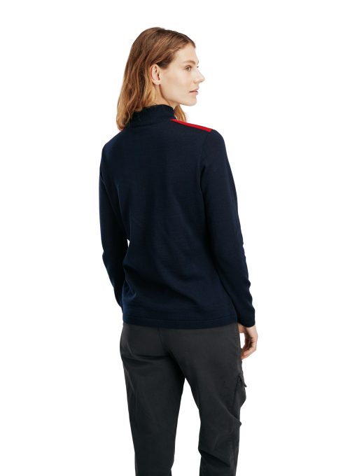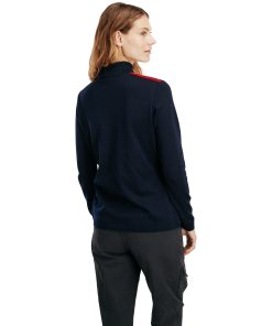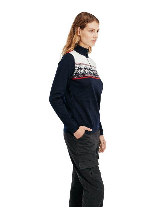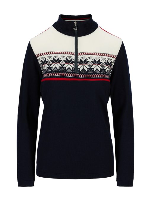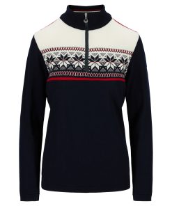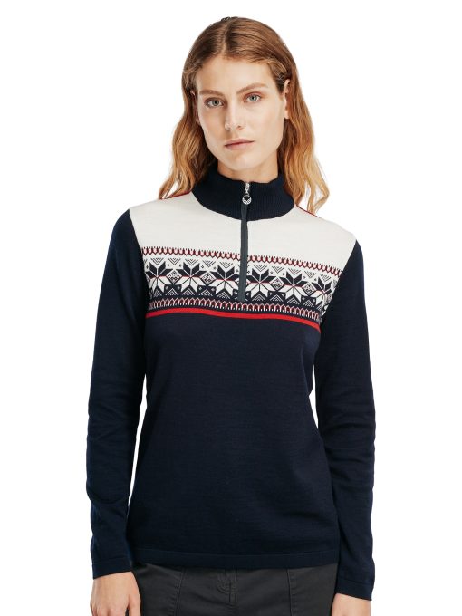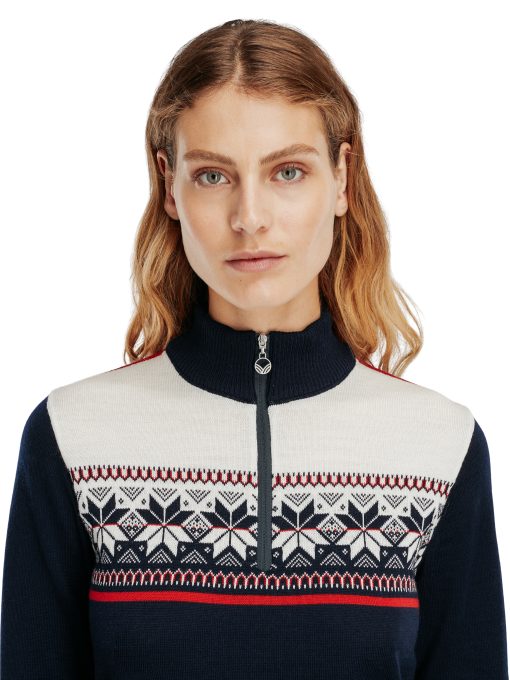 A sporty, lightweight and soft merino wool sweater with block colors and pattern with the classic eight-petal rose. The sweater has a medium high neck with a zipper and can be worn both for leisure and sports.