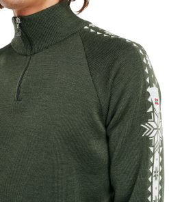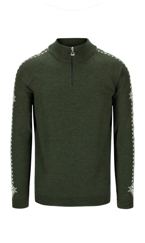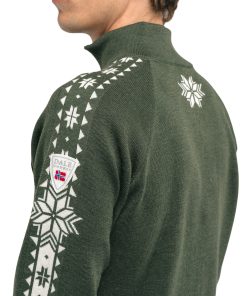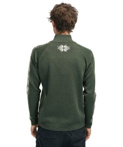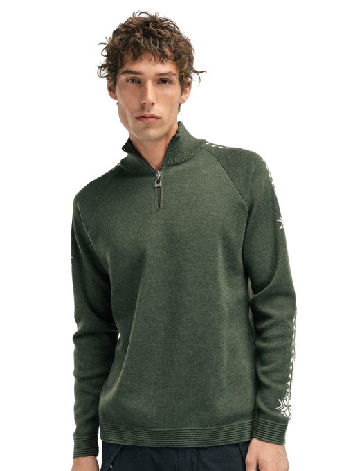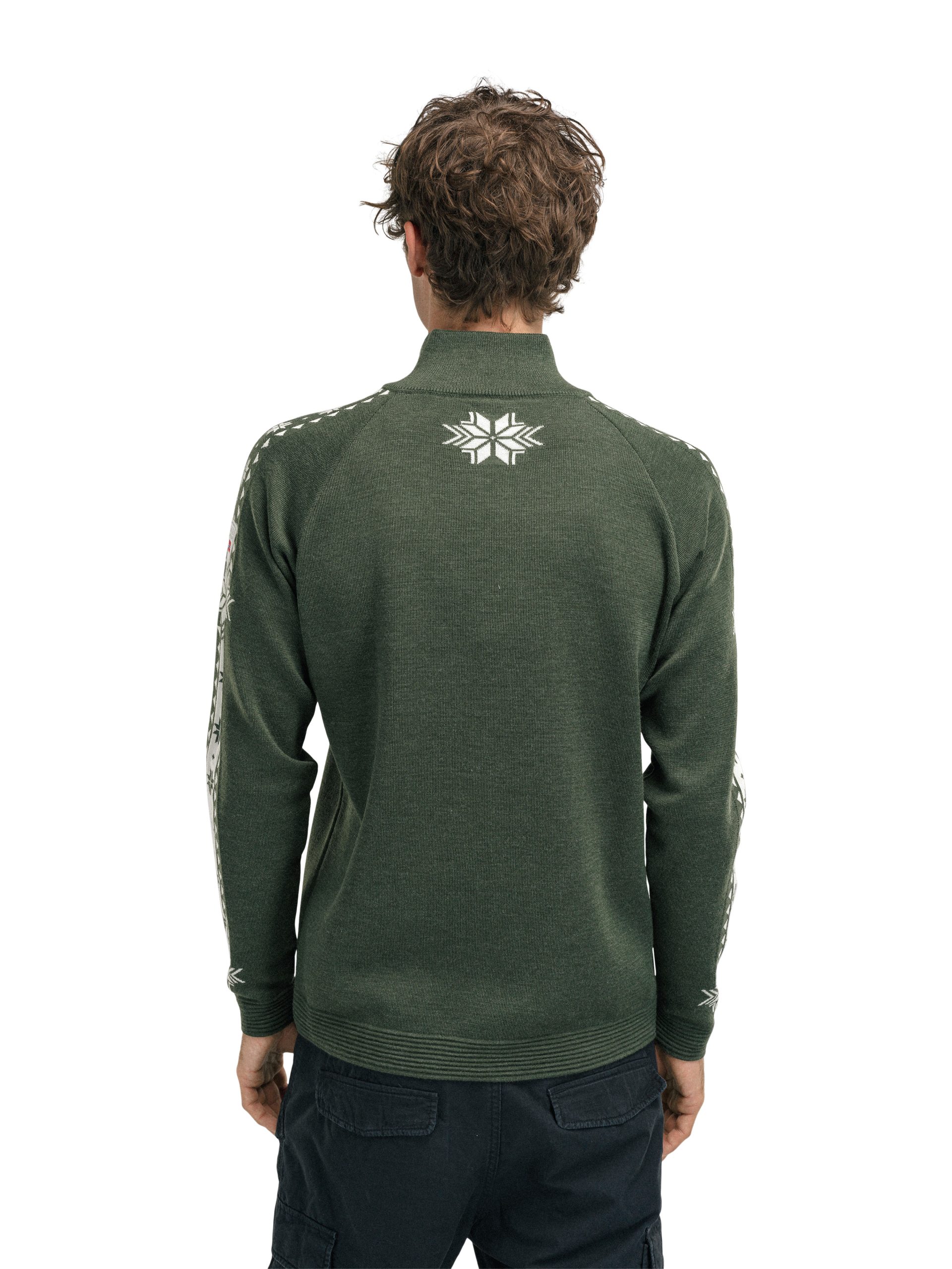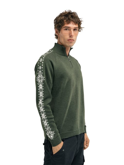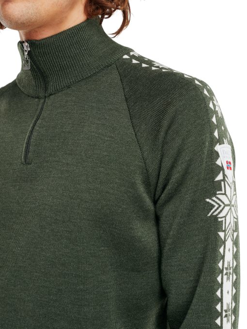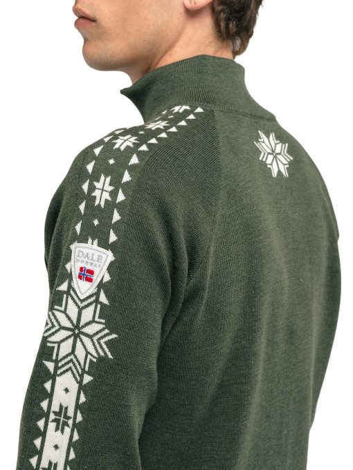 Made from 100% premium skin-soft merino wool, the sweater features a quarter-zip and a medium-high neck for comfort and versatility. A repetitive pattern of the Norwegian eight-petal rose along the sleeves, paired with a large eight-petal rose knitted into the back, gives this timeless sweater a refined, sporty look.