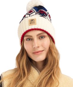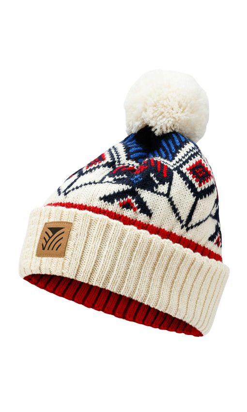 A wool hat with enlarged and simplified pattern featuring the classic Norwegian eight-petal rose. There’s a note of the 50s and the 60s in the hat’s bold pattern. The Vilja hat is made with 100% lightweight wool and features a rib knit brim with skin soft merino wool on the inside.